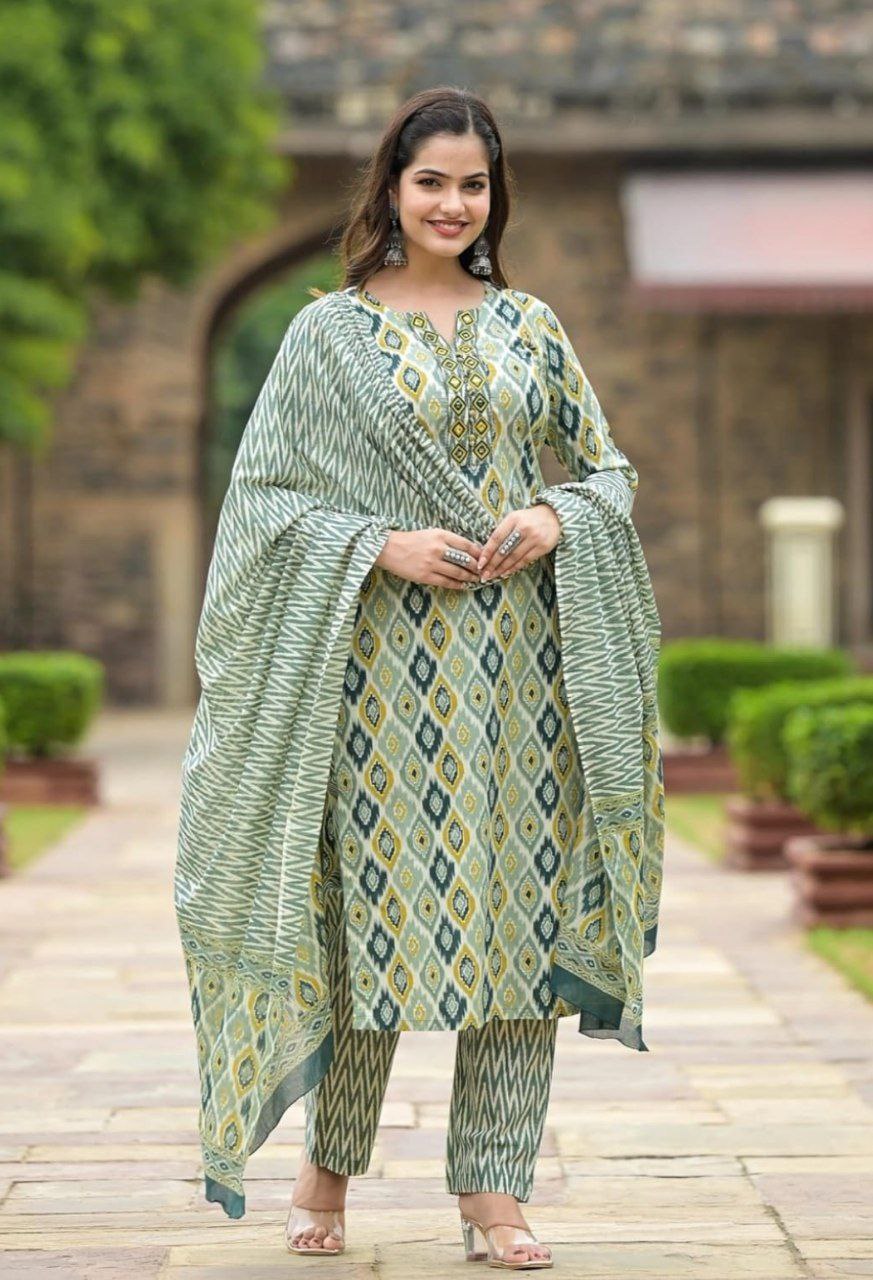 Step into everyday elegance with the Salwar Love Green Printed Cotton Kurta Set – designed for comfort, charm, and confidence. This ready-to-wear outfit features a soothing green color with eye-catching ethnic prints, three-quarter sleeves, and a matching printed cotton dupatta to complete the look.