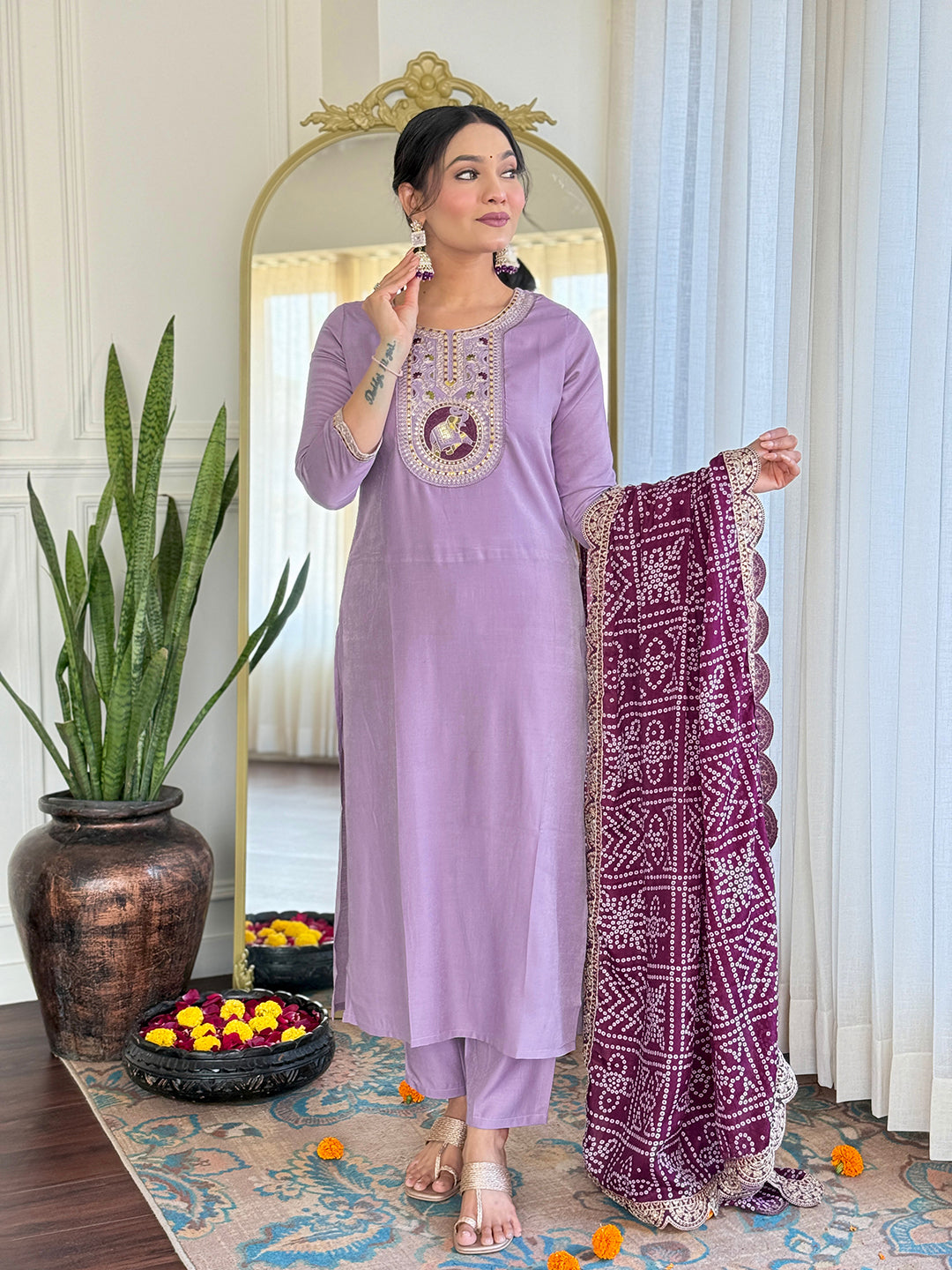 Step into a world of grace and tradition with this lavender rayon suit set, accentuated by intricate embroidery and a stunning contrast bandhani-style organza dupatta. The rich maroon tones of the dupatta, adorned with scalloped lace borders, bring festive vibrance to this soft and subtle look. 🌟🌺
